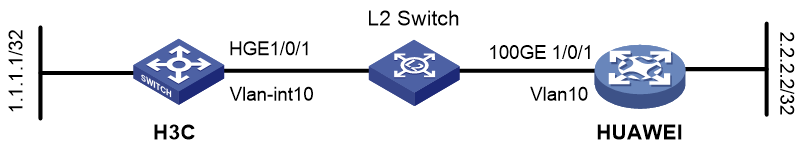 如圖8-5所示,H3C設備與華為設備通過二層交換機連接。現要求使用靜態路由與BFD聯動技術,實現H3C設備或華為設備與二層交換機之間的鏈路出現故障時,BFD能夠快速感知並通告靜態路由。
