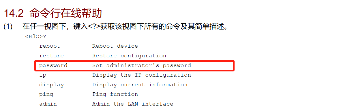 <H3C>提示進入設備命令行,輸入password命令並回車,按照係統提示,提示:enter new password(輸入新密碼),則可以直接輸入新密碼,並重新輸入一次確認即可。